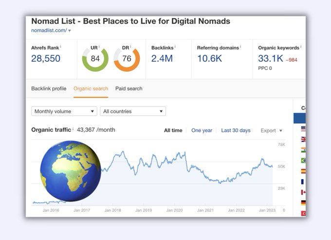 $2MM/year with a directory dite 🖥️🌎 (@NomadList) @levelsio's programmatic SEO strategy is brilliant ✅ $2,000,000/year in revenue ✅ ~34k organic keyword rankings ✅ ~45k/mo in organic traffic A breakdown of his programmatic SEO strategy 🧵⬇️